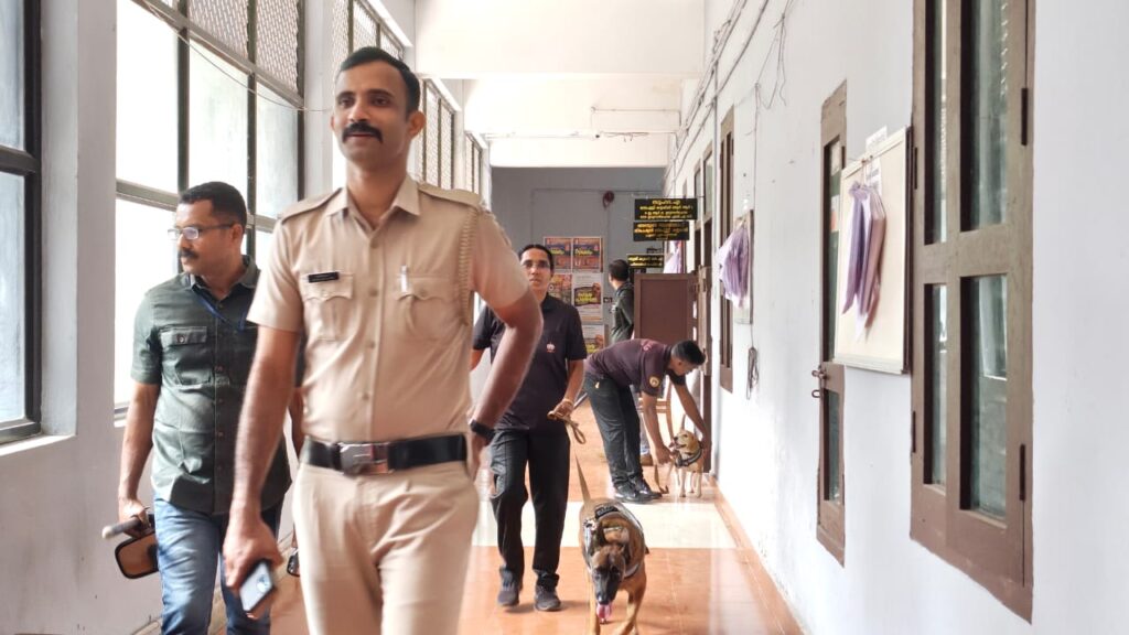ബോംബ് സ്ക്വാഡ് ജില്ലാ ചാർജ് ഓഫീസർ പി മനോജ് കുമാറിന്റെ നേതൃത്വത്തിലുള്ള അഞ്ചംഗ സംഘമാണ് പരിശോധന നടത്തിയത്. ബോംബ് കണ്ടെത്താൻ വൈദഗ്ധ്യം നേടിയ മാഗി, ഡോളി തുടങ്ങിയ നായകളാണ് പരിശോധന നടത്തിയത്. ബോംബ് സ്ക്വാഡ് പരിശോധന തുടർന്ന് കൊണ്ടിരി ക്കുകയാണ്.